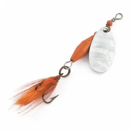 Oznaczenia wyraźnie wybite na srebrnej paletce identyfikują tę konkretną błystkę Abu Garcia Spinnaren Reflex jako doskonale zachowany okaz. Błystka obrotowa o wadze 1/8 oz (4 g) oparta jest na niklowanej, młotkowanej paletce, która zapewnia stałe odblaski. Jaskrawopomarańczowy korpus uzupełnia dopasowany chwost z piór na kotwicy, zwiększający objętość 5-centymetrowego profilu. Czerwone plastikowe koraliki umieszczone na drucianym stelażu pełnią rolę łożysk, ułatwiając rotację strzemiączka podczas prowadzenia. Zarejestrowana pod kodem produktu 24622, przynęta utrzymuje ocenę stanu 5/5 ze wszystkimi w pełni nienaruszonymi elementami.