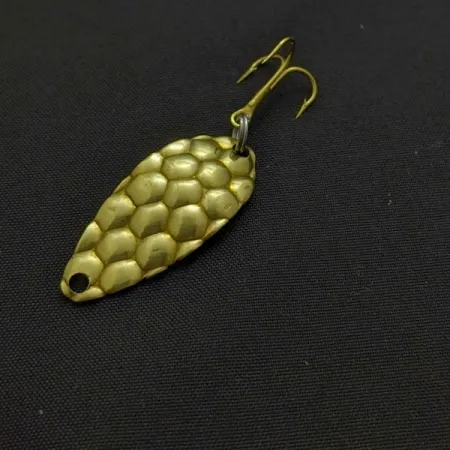 Teksturowany wzór bąbelków na wypukłej stronie tej złotej wahadłówki o długości 1 1/4" (3 cm) zapewnia wyraźną sygnaturę wizualną podczas rzutów lekkim zestawem. Ważąca 1/8 oz (3,5 g) Acme Little Cleo posiada tłoczone wykończenie w formie łuski, zaprojektowane tak, aby łapać i odbijać światło. Spód błystki jest gładki, z wybitą nazwą producenta. Kod produktu 24586, stan 5/5. Z tyłu zamontowana jest kotwica w kolorze złotym, pasująca do metalicznego wyglądu korpusu.