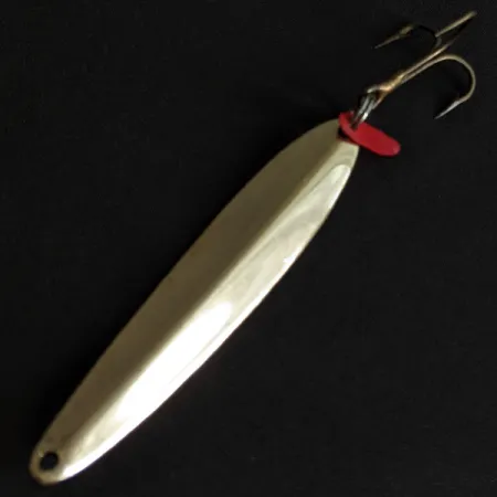 Ta klasyczna błystka o długości 9 cm (3 1/2") wyróżnia się lśniącym złotym wykończeniem, które mimo upływu lat pozostało w nienagannym stanie. Firma Bay de Noc od ponad 50 lat wytwarza te przynęty w USA, bazując na skandynawskich projektach stworzonych z myślą o łowieniu w pionie i wędkarstwie podlodowym. Ten konkretny egzemplarz o kodzie produktu 19501 waży 28 g (1 uncję), co pozwala skutecznie sięgać głębszych partii wody. Przy kółku łącznikowym obok kotwicy zamocowano charakterystyczne czerwone skrzydełko z tworzywa, które stanowi wyraźny akcent na tle polerowanego metalowego korpusu. Stan przedmiotu to 5/5 – brak jakichkolwiek śladów zużycia na powierzchniach czy elementach uzbrojenia.