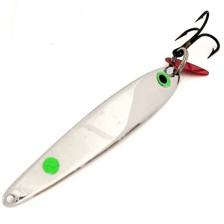 Ważąca solidne 40 g (1 1/3 oz) ciężka błystka pionowa to specjalistyczne narzędzie do łowienia dużych drapieżników w głębokiej wodzie. Korpus w kolorze jasnego niklu zapewnia mocne odblaski, podkreślone dwiema jaskrawozielonymi kropkami: jedna pełni rolę oka z ciemną źrenicą, a druga znajduje się przy ogonie. Ta 10-centymetrowa (4") przynęta, uzbrojona w mocną kotwicę Mustad i klasyczny czerwony plastikowy listek wabiący, jest przeznaczona na głębokości powyżej 5 m (16 ft). Jest to większy model w rozmiarze #9 z serii Bay de Noc o kodzie produktu 13034, zachowany w stanie 5/5. Ten amerykański klasyk został zaprojektowany do ciężkiego jigowania pionowego zarówno na wodach otwartych, jak i spod lodu, z myślą o okazowych sandaczach i paliach jeziorowych.