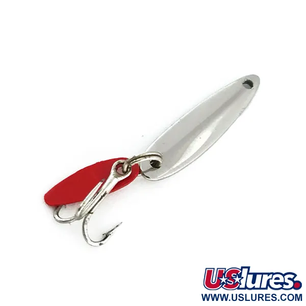 Ta klasyczna amerykańska błystka o długości 1 1/4 cala (3 cm) lśni polerowanym niklowym wykończeniem. Firma Bay de Noc od dziesięcioleci wytwarza w USA model Swedish Pimple — oznaczony tutaj kodem produktu 9014 — czerpiąc inspirację z tradycyjnych skandynawskich metod łowienia w pionie. Waga 1/16 oz (2 g) sprawia, że jest to wszechstronny wybór na okonie lub pstrągi, zwłaszcza dzięki czerwonemu plastikowemu skrzydełku przy oczku haczyka, które służy jako wyraźny punkt wabiący. Ta konkretna przynęta jest w stanie 5/5, zachowując lustrzaną powierzchnię oraz czyste, oryginalne zbrojenie. Jej smukły kształt łezki został zaprojektowany do pionowej prezentacji pod lodem lub spinningowania w otwartej wodzie, gdzie powłoka przypominająca chrom odbija światło. Mały otwór w górnej części zapewnia stabilny punkt mocowania, utrzymując smukły profil przynęty na różnych głębokościach.