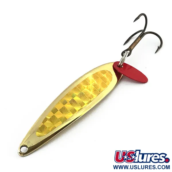 Solidna waga 14 g (1/2 oz) przy długości 5,5 cm (2 1/4") sprawia, że ta błystka podlodowa szybko opada w strefę żerowania ryb. Ten model Swedish Pimple od Bay de Noc o kodzie produktu 9053 posiada złote wykończenie na wysoki połysk, wzbogacone żółtą holograficzną taśmą w kratkę, która generuje wielokierunkowe odblaski. Na spodzie zamontowano solidną kotwiczkę wraz z niewielkim czerwonym plastikowym skrzydełkiem, które stanowi wyraźny punkt przyciągający uwagę na tle złotego korpusu. Przynęta ta, wyprodukowana w USA, jest kontynuacją wzornictwa cenionego przez pokolenia wędkarzy podlodowych i spinningowych polujących na głęboko żerujące sandacze i pstrągi. Uzbrojenie oraz złocenie są w doskonałym stanie, co pozwala ocenić ten egzemplarz na 5/5. W przewężonej części znajduje się czysty otwór do wiązania żyłki, natomiast na odwrocie widać gładką, lustrzaną złotą powierzchnię, charakterystyczną dla tych klasyków z Michigan.