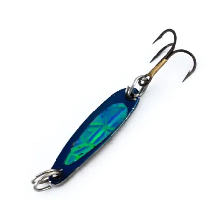 Przy wadze zaledwie 2 g (1/16 oz), ta niewielka błystka podlodowa reprezentuje najmniejszy profil w ofercie Bay de Noc. Przy długości 2,5 cm (1"), jej przednia strona posiada ciemnoniebieskie wykończenie, ozdobione wyrazistą naklejką holograficzną, mieniącą się w odcieniach zieleni i turkusu. Ten odbijający światło element zestawiono z polerowanym, srebrnym tyłem, co zapewnia wysoki kontrast wizualny, szczególnie skuteczny w mętnej wodzie lub przy słabym oświetleniu pod lodem. Egzemplarz o kodzie produktu 9956 posiada oryginalne kółka łącznikowe oraz ostrą kotwiczkę. Osprzęt pozostaje lśniący i w pełni sprawny, a ogólny stan przynęty oceniono na 5/5. Te amerykańskie przynęty od ponad pięćdziesięciu lat stanowią wędkarską klasykę dzięki solidnej metalowej konstrukcji, zaprojektowanej z myślą o szybkim opadzie w strefę żerowania okoni, pstrągów czy sandaczy.