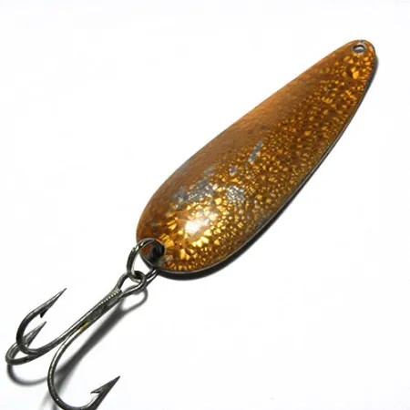 Przy długości 9 cm (3 1/2 cala) ta wahadłówka reprezentuje segment przynęt do ciężkiego łowienia w ofercie Eppingera. Ten konkretny model Dardevle o kodzie produktu 0306 wyróżnia się charakterystycznym wykończeniem Crystal (Golden Scale) – fakturowanym wzorem w bursztynowym odcieniu, stworzonym by skutecznie odbijać światło w różnych warunkach na wodzie. Dzięki konkretnej wadze 28 g (1 oz), przynęta posiada masę niezbędną do prowadzenia w głębokiej wodzie oraz do oddawania dalekich rzutów. Po wklęsłej stronie w metalu głęboko wybito klasyczną sygnaturę DARDEVLE, będącą znakiem rozpoznawczym firmy założonej przez Lou Eppingera w 1906 roku w Detroit w stanie Michigan. Oryginalna, duża kotwica jest zamocowana na solidnym kółku łącznikowym i jest gotowa do użycia nad wodą. Wykończenie złotej łuski posiada pewne przetarcia i naturalne ślady użytkowania na fakturowanej powierzchni, przez co miejscami – szczególnie w środkowej części i na krawędziach – widoczny jest jasny metal bazowy. Egzemplarz jest czysty i zachowuje estetyczny wygląd, co pozwala na ocenę jego stanu 3/5. To autentyczny kawałek historii amerykańskiego sprzętu wędkarskiego, odzwierciedlający tę samą trwałą konstrukcję, dzięki której przynęty te trafiały niegdyś do wojskowych lotniczych zestawów przetrwania.