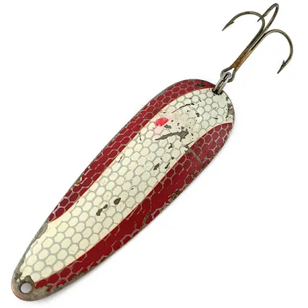 Ważąca solidne 28 g (1 oz), ta klasyczna wahadłówka wyróżnia się tradycyjnym wykończeniem z fakturą łuski w kolorach biało-czerwonym. Przy długości 9 cm (3 1/2"), na spodzie błystki widnieje charakterystyczna sygnatura „DARDEVLE DETROIT U.S.A.” – detal ten wskazuje na okres produkcji sprzed 1959 roku, kiedy to Lou Eppinger przeniósł zakład do Dearborn. Ten konkretny egzemplarz, oznaczony kodem produktu 19164, posiada na wypukłej stronie wzór łuski typu „honeycomb” (plaster miodu), co stanowi ciekawą odmianę dla powszechnie spotykanych gładkich powłok malarskich. Niklowany spód zachował swój blask, natomiast na malowanej stronie widoczne są drobne ślady użytkowania i niewielkie odpryski z poprzednich wypraw nad wodę, co pozwala ocenić jej stan na solidne 4/5. Błystka uzbrojona jest w dużą, brązowaną kotwicę zamocowaną na mocnym kółku łącznikowym, stworzoną do walki z silnymi szczupakami i muskie. Przednie oczko jest czyste i drożne, gotowe do podpięcia przyponu lub agrafki z krętlikiem.