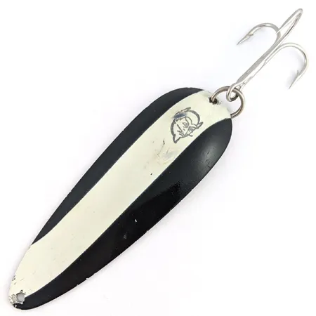 Ważąca solidne 28 g (1 oz) wahadłówka o grubym korpusie zapewnia masę niezbędną do wykonywania dalekich rzutów. Malowanie "Black Devle" gwarantuje doskonałą widoczność dzięki dużemu kontrastowi – biały pasek pośrodku otoczony jest głęboką czernią, a całości dopełnia klasyczna grafika z głową diabła. Przynęta ma 9 cm (3 1/2") długości, a na jej odwrocie wybito napis „DARDEVLE BY EPPINGER DEARBORN MI”, co wskazuje na okres produkcji po przeniesieniu firmy z Detroit w 1959 roku. Model oznaczony kodem produktu 23379 zachował oryginalne uzbrojenie w postaci srebrzystej kotwiczki i kółka łącznikowego. Stan przynęty to mocne 4/5; widoczne są jedynie drobne powierzchniowe zarysowania na chromowanym spodzie oraz niewielkie odpryski farby przy samym oczku do wiązania linki. Charakterystyczny, podłużny kształt i wklęsły profil generują kolebiącą pracę podczas prowadzenia w wodzie. Ta wyprodukowana w USA blacha dzięki swojej wadze stabilnie trzyma się głębi, co pozwala na skuteczne obławianie stanowisk szczupaków i dużych pstrągów. Oznaczenia wagi oraz producenta są głęboko wytłoczone w metalu, co gwarantuje ich czytelność przez długie lata.