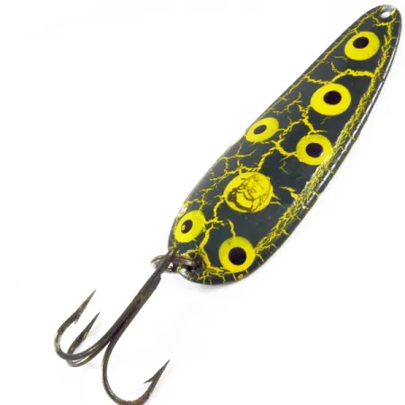 Ta klasyczna wahadłówka o wadze 28 g (1 oz) stanowi świadectwo tradycji marki Lou Eppingera, zapoczątkowanej w Detroit w 1906 roku. Wariant kolorystyczny Frog wyróżnia się intensywną żółtą bazą z ciemnozielonym wzorem typu „crackle” i wyraźnymi kropkami imitującymi oczy, co kontrastuje z lśniącym, niklowanym wykończeniem rewersu. Przy długości 9 cm (3 1/2") charakterystyczny, wydłużony kształt i głębokie wklęśnięcie błystki, uzyskane dzięki autorskim matrycom Eppingera, zapewniają jej unikalną, kolebiącą pracę podczas rzutów oraz trollingu. Egzemplarz o kodzie produktu 3498 zachował się w świetnej formie, otrzymując najwyższą notę stanu 5/5. Na wypolerowanym tyle widnieją czytelne, oryginalne tłoczenia „DARDEVLE”, „EPPINGER” oraz „U.S.A.”, potwierdzające autentyczność tego amerykańskiego wyrobu. Uzbrojenie obejmuje solidną kotwicę zamocowaną na mocnym kółku łącznikowym. Choć w 1959 roku Lou Eppinger przeniósł zakład do Dearborn, pierwotny projekt pozostał niezmieniony, gdyż od ponad stu lat potwierdza swoją skuteczność nad wodą. Nawet rząd Stanów Zjednoczonych docenił niezawodność tej konstrukcji, umieszczając wahadłówki Dardevle w wojskowych zestawach survivalowych w okresie wojennym.