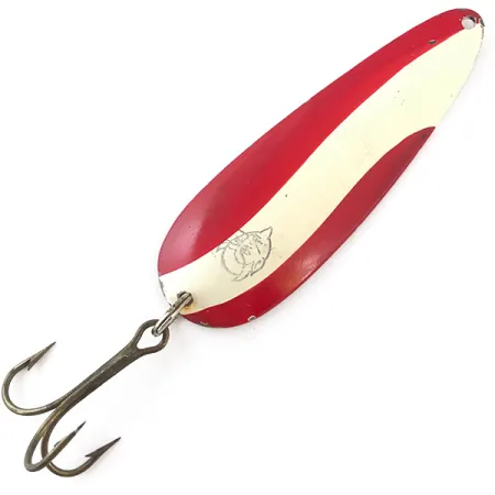 Ważąca solidne 28 g (1 uncję) klasyczna wahadłówka to kawałek historii amerykańskiego wędkarstwa z warsztatów Eppingera. Na przedniej stronie znajdują się kultowe czerwono-białe ukośne pasy – wzór, który na stałe zagościł w pudełkach wędkarskich, odkąd Lou Eppinger zaczął tworzyć przynęty w swojej piwnicy w Detroit w 1906 roku. Przy długości 9 cm (3 1/2") korpus błystki zwęża się ku mocowaniu, gdzie precyzyjnie wycięty otwór pozwala na łatwe zapięcie agrafki lub grubego przyponu. Po drugiej stronie przynęta posiada lśniące, niklowane wykończenie z głębokim, wybitym oznaczeniem „DARDEVLE” DETROIT U.S.A. To konkretne tłoczenie stanowi bezpośrednie nawiązanie do początków produkcji marki w Michigan. Na malowanej stronie, tuż przy mocowaniu kotwicy, wyraźnie widoczne jest słynne logo z głową diabła, potwierdzające autentyczność modelu o kodzie produktu 4200. Uzbrojenie stanowi pojedyncza kotwica osadzona na wytrzymałym kółku łącznikowym, przygotowana do holu większych drapieżników. Stan zachowania oceniony na 4/5 – emalia jest świetnie utrzymana, z jedynie minimalnymi śladami użytkowania. Polerowany, niklowany tył zapewnia silne błyski i kontrast niezbędny do skutecznego wabienia ryb w czystszej wodzie.