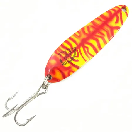 Na mosiężnym rewersie wyraźnie wybito oznaczenie „COP-E-CAT 7300 DETROIT U.S.A.”, co stanowi bezpośrednie nawiązanie do bogatej historii produkcji firmy Eppinger w stanie Michigan. Błystka o długości 5,5 cm (2 1/4") i wadze 10 g (1/3 oz) posiada tradycyjne wklęsłe wyprofilowanie, które stało się znakiem rozpoznawczym marki już w czasach pierwszych warsztatów Lou Eppingera. Przednia strona wykończona jest w jaskrawym, kontrastowym czerwono-żółtym wzorze, uzupełnionym o niewielką grafikę przedstawiającą czarnego, skaczącego delfina w centralnej części. Egzemplarz jest w wyjątkowym stanie, ocenionym na 5/5, a oryginalna kotwica wraz z kółkiem łącznikowym nie wykazują żadnych śladów użytkowania ani upływu czasu. W górnej części przynęty znajduje się precyzyjnie wybity otwór, zaprojektowany pod kątem różnych agrafek i przyponów, sprawdzający się zarówno w spinningu, jak i trollingu. Przy użyciu autorskich matryc, firma Eppinger stworzyła ten wariant modelu Cop-E-Cat na bazie solidnego mosiądzu, który zapewnia wyraźny błysk w momencie wyeksponowania tyłu przynęty.