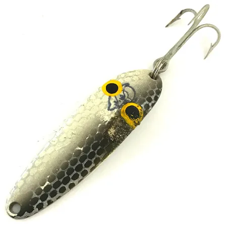 Wykończenie z młotkowanego niklu stanowi bazę dla charakterystycznego szczupakowego wzoru tej klasycznej wahadłówki, efektownie odbijając światło od swojej teksturowanej powierzchni. Przy wadze 1/3 uncji (10 g) i długości 2 1/4 cala (5,5 cm), ta błystka Eppinger Dardevle Cop-E-Cat 7300 posiada kod produktu 5652. Wklęsły profil to znak rozpoznawczy konstrukcji Eppingera, który w tym modelu połączono z kotwicą oraz wyraźnymi żółto-czarnymi oczami namalowanymi na przedniej krawędzi. Na rewersie wybita sygnatura „COP-E-CAT 7300” wraz z napisem „DETROIT U.S.A.” wskazuje na wczesne lata produkcji, zanim firma przeniosła się do Dearborn w 1959 roku. Ten konkretny egzemplarz zachowany jest w solidnym stanie 4/5, nosząc lekkie ślady przechowywania w pudełku wędkarskim, przy jednoczesnym zachowaniu wyraźnych oznaczeń i oryginalnego uzbrojenia. Zaprojektowany do spinningu lub trollingu metalowy korpus został zbudowany tak, aby wytrzymać ataki agresywnych ryb drapieżnych. Wzór imitujący łuskę przechodzi od ciemnej szarości do jasnego srebra, naśladując naturalny blask drobnicy występującej w wodach Ameryki Północnej.