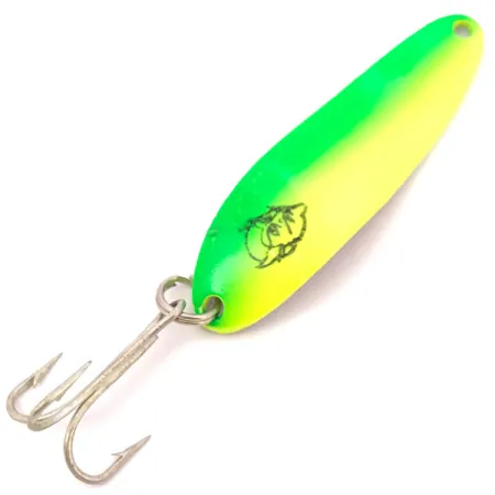Wyrazisty gradient w kolorze chartreuse płynnie przechodzi w jaskrawą żółć na malowanej stronie tej 10-gramowej (1/3 oz) wahadłówki. Ten konkretny egzemplarz o długości 5,5 cm (2 1/4"), oznaczony kodem produktu 3920, posiada klasyczną powłokę UV Glow, zaprojektowaną z myślą o widoczności w głębokiej lub mętnej wodzie. W górnej części wyraźnie widoczny jest charakterystyczny czarny stempel z głową kota – znak rozpoznawczy serii Cop-E-Cat. Na rewersie z polerowanego niklu widnieje wyraźne tłoczenie "COP-E-CAT 7300 DETROIT U.S.A.", nawiązujące do historycznych korzeni firmy w Michigan przed jej przeniesieniem do Dearborn w 1959 roku. Przynęta zachowana jest w wyjątkowym stanie 5/5, z czystą, lśniącą powierzchnią i ostrym zbrojeniem. Konstrukcję dopełnia mocna kotwiczka w srebrnym kolorze, zamocowana na solidnym kółku łącznikowym, gotowa do spinningu lub trollingu. Wklęsły profil korpusu to znak rozpoznawczy konstrukcji Eppingera, zapewniający stabilną pracę w toni wodnej, podczas gdy fluorescencyjna farba reaguje na docierające światło.