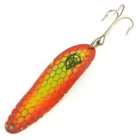 Ważąca 1/3 oz (10 g) wahadłówka posiada masę niezbędną do dalekich rzutów w głębokiej wodzie lub prowadzenia w stabilnym trollingu. Eppinger Dardevle Cop-E-Cat 7300 UV wyróżnia się efektownym wzorem łuski w formie plastra miodu w intensywnych odcieniach pomarańczu i żółci na mocno połyskującej, niklowanej bazie. Przy długości 2 1/4" (5,5 cm), jej podłużny korpus nawiązuje do klasycznego amerykańskiego projektu, który Lou Eppinger zapoczątkował w Michigan. Pod wpływem światła UV środkowa, żółta część zmienia barwę na jaskrawozielone świecenie, zapewniając doskonałą widoczność w mętnej lub głębokiej wodzie. Ten konkretny egzemplarz, oznaczony kodem produktu 6377, jest w stanie 5/5, zachowując czyste i lśniące wykończenie doskonale utrzymanej przynęty. Jest uzbrojona w ostrą kotwiczkę zamocowaną na solidnym kółku łącznikowym. Na przedniej stronie znajduje się kultowe tłoczenie Dardevle, co potwierdza, że jest to autentyczny element wędkarskiej historii Detroit.