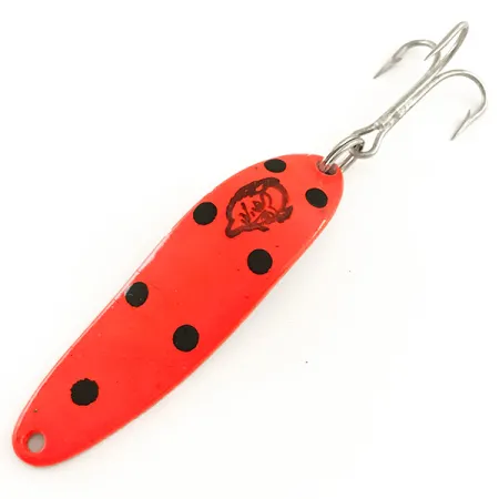 Czarne kropki na głębokim wykończeniu wyraźnie kontrastują z jaskrawym, fluorescencyjnym, czerwono-pomarańczowym przodem tej klasycznej wahadłówki. Ważący 10 g (1/3 oz) egzemplarz to Dardevle Cop-E-Cat 7300 UV, opatrzony kultowym tłoczeniem głowy diabła, którego firma Eppinger używa od swoich początków w Michigan. Błystka o długości 5,5 cm (2 1/4") posiada charakterystyczny podłużny kształt i wklęsły profil, wytwarzany przy użyciu autorskich matryc firmy od ponad stu lat. W świetle UV fluorescencyjna powłoka reaguje jasnym, intensywnym blaskiem, stanowiąc nowoczesną ewolucję tradycyjnych wzorów marki wywodzącej się z Detroit. Rewers wykończono w niklu, co jest klasycznym rozwiązaniem zapewniającym widoczność w wodach o różnej przejrzystości. Ta konkretna przynęta jest w stanie 5/5, wygląda wyjątkowo czysto, z nienaruszonym oryginalnym uzbrojeniem i kotwicą. Seria Cop-E-Cat została zaprojektowana do spinningowania lub trollingu, wykorzystując swoją specyficzną budowę do generowania charakterystycznej pracy wahadłowej w toni wodnej. Kod produktu 6436.