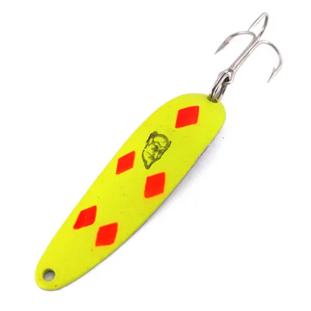 Klasyczna wahadłówka Eppinger Dardevle Cop-E-Cat 7400 o masie 1/2 oz (14 g) i długości całkowitej 2 1/2" (6,5 cm) w kultowym wzorze Five of Diamonds to pozycja obowiązkowa w arsenale każdego wędkarza. Ten konkretny egzemplarz, oznaczony kodem produktu 10210, posiada fluorescencyjne wykończenie UV Glow, które pozostaje doskonale widoczne nawet w głębokiej lub mętnej wodzie. Kultowe logo z głową diabła jest precyzyjnie wyśrodkowane na żółtej, wklęsłej powierzchni w otoczeniu pięciu wyraźnych, czerwonych rombów. Przynęta w stanie 5/5 zachowuje fabryczny blask i jest wyposażona w oryginalne, wysokiej jakości uzbrojenie, w tym solidne kółko łącznikowe i kotwicę. Firma Eppinger produkuje te błystki w Michigan od 1906 roku, wykorzystując własne matryce, aby zapewnić precyzyjną wagę i wyważenie niezbędne dla ich charakterystycznej, kolebiącej pracy. Choć standardowy wzór Five of Diamonds jest legendarny, ta fluorescencyjna wersja daje dodatkową przewagę podczas spinningowania lub trollingu w warunkach słabego oświetlenia. Metalowa konstrukcja stanowi dowód amerykańskiej trwałości, dzięki której przynęty te od ponad stulecia znajdują miejsce w zestawach survivalowych i pudełkach wędkarskich.