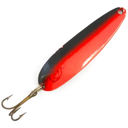 Na niklowanym, połyskującym tyle tej wahadłówki wybito oznaczenie COP-E-CAT 7400 DETROIT USA, co potwierdza produkcję przed przeprowadzką firmy Eppinger do Dearborn w 1959 roku. Przednia strona przynęty posiada intensywne, czerwono-czarne malowanie, które jest zarówno fluorescencyjne, jak i wyposażone w powłokę UV dla lepszej widoczności w głębokiej lub mętnej wodzie. Przy długości 2 1/2" (6,5 cm) i wadze 1/2 oz (14 g), błystka posiada klasyczny, wklęsły profil, który nadaje jej charakterystyczną, kolebiącą pracę. Oryginalna kotwica jest solidnie zamocowana na kółku łącznikowym, a powłoka lakiernicza i galwaniczna pozostają w dobrym stanie, co pozwala ocenić kondycję egzemplarza na 4/5. Kunszt Lou Eppingera jest widoczny w wybitych detalach oraz precyzyjnym wyprofilowaniu metalu – to wzór, który zaczął dopracowywać w swojej piwnicy w Michigan ponad sto lat temu. Ten egzemplarz, oznaczony kodem produktu 4917, stanowi solidny przykład amerykańskiej produkcji sprzętu wędkarskiego z połowy ubiegłego wieku, z okresu działalności w Detroit.
