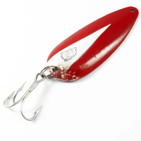 Miedziana powłoka na spodzie tej wahadłówki Eppinger Dardevle Dardevlet posiada kultowe tłoczenie „Detroit”, co potwierdza jej pochodzenie z historycznego okresu produkcji tej marki. Ten egzemplarz o kodzie produktu 3434 waży 3/4 oz (21 g), ma długość 2 3/4 cala (7 cm) i posiada charakterystyczne logo z głową diabła na przedniej stronie. Klasyczne biało-czerwone malowanie naniesiono z charakterystycznym białym pasem przez środek – to wzór opracowany przez Lou Eppingera przy użyciu autorskich matryc, aby imitować osłabioną drobnicę. Stan tego egzemplarza oceniam na 4/5; widać na nim autentyczne ślady użytkowania w postaci ubytków farby i przetarć, skupionych głównie w okolicach dolnego kółka i mocowania kotwicy, podczas gdy tłoczony miedziany tył pozostaje jasny i wyraźny. Przynęta jest wyposażona w oryginalną kotwicę, dostosowaną do ciężkiego spinningu, do którego ten model został stworzony. Podczas łowienia tymi wahadłówkami miedziany tył okazuje się szczególnie przydatny, generując ciepły odblask w mętnej lub trąconej wodzie – to trik stosowany od dekad przez doświadczonych wędkarzy, by sprowokować brania, gdy zawodzi niklowane wykończenie. Podłużny, wklęsły korpus zaprojektowano tak, aby podczas prowadzenia pracował charakterystycznym ruchem wahadłowym, pozostając wiernym projektom z Detroit, które wypełniają pudełka wędkarskie już od 1906 roku.