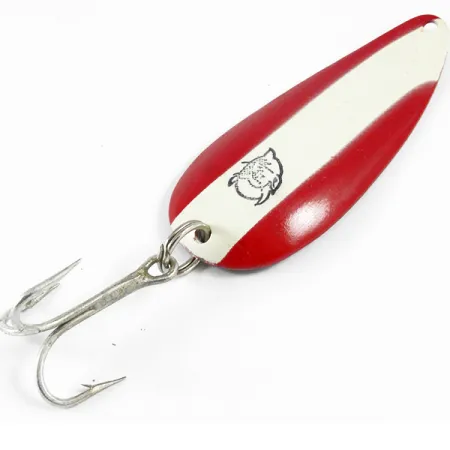 Na wypolerowanej, niklowanej i wklęsłej powierzchni tej 21-gramowej (3/4 oz) wahadłówki wyraźnie wybito oznaczenie „DARDEVLET” Detroit U.S.A., co potwierdza jej przynależność do legendarnej serii Eppinger. Przy długości 7 cm (2 3/4") przynęta prezentuje charakterystyczne malowanie w czerwono-białe pasy – wzór nierozerwalnie kojarzony z historią produkcji sprzętu wędkarskiego w stanie Michigan. Na środkowym białym pasie znajduje się klasyczne logo z czarną głową diabła, które wyraźnie odcina się na tle czystej farby. Ten egzemplarz, oznaczony kodem produktu 3499, zachowuje lśniący wygląd zarówno na niklowanym rewersie, jak i na kolorowym awersie. Zbrojenie, w tym kółko łącznikowe oraz kotwica, pozostaje solidne i w nienaruszonym stanie. Oceniona na 5/5, przynęta jest wyjątkowo zadbanym przykładem średniej wielkości wahadłówki wyrzutowej, produkowanej przy użyciu autorskich matryc firmy, które zapewniają specyficzną grubość metalu i rozkład masy niezbędny do dalekich rzutów.