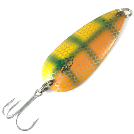 Jaskrawozielone, pionowe pasy na tle żółto-pomarańczowego wzoru plastra miodu nadają tej klasycznej wahadłówce Eppinger Dardevlet charakterystyczny wygląd. Na rewersie wybito napis „DARDEVLET DETROIT USA” – ten mierzący 2 3/4 cala (7 cm) egzemplarz pochodzi z okresu sprzed przeniesienia siedziby marki do Dearborn w 1959 roku i waży solidne 3/4 uncji (21 g). Kod produktu 3695 identyfikuje przynętę w stanie 5/5, z czystym, niklowanym wykończeniem na wklęsłej powierzchni wewnętrznej. Jej podłużny kształt i unikalna konstrukcja korpusu mają na celu wygenerowanie pracy wahadłowej podczas wolnego prowadzenia. Ta wyprodukowana w USA wahadłówka jest wyposażona w oryginalną kotwicę i kółka łącznikowe, co odzwierciedla jakość wykonania, dzięki której przynęty Dardevle trafiały do zestawów przetrwania lotnictwa wojskowego. Kolekcjonerzy zwrócą uwagę na wyraźne tłoczenie „Detroit”, które podkreśla wczesny etap historii produkcji tej marki. Delikatne ruchy szczytówką podczas zwijania mogą nadać jej migotliwą pracę, która często prowokuje do ataku ciekawskie drapieżniki.