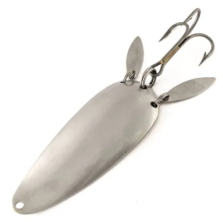 Ważąca 3/4 uncji (21 g) wahadłówka z grubej blachy to wyjątkowy okaz dla każdego kolekcjonera specjalizującego się w sprzęcie wędkarskim z Michigan. Cechą charakterystyczną tego modelu Dardevlet Klicker jest para małych, metalowych paletek w kształcie łezki, zamocowanych na tylnym kółku łącznikowym obok kotwiczki. Podczas prowadzenia paletki uderzają o korpus przynęty, generując mechaniczne klikanie, które dopełnia refleksy świetlne srebrnego wykończenia. Na rewersie znajduje się wyraźny, głęboko tłoczony napis identyfikujący ją jako autentyczny produkt „DARDEVLET” z „DETROIT U.S.A.”, co świadczy o jej pochodzeniu sprzed przeniesienia zakładów Eppinger do Dearborn w 1959 roku. Mierzący 2 3/4 cala (7 cm) egzemplarz o kodzie produktu 12300 jest zachowany w doskonałym stanie. Polerowana srebrna powierzchnia jest wolna od istotnych skaz czy śladów utleniania, co potwierdza stan 5/5. Solidna kotwiczka jest zamocowana za pomocą wytrzymałego kółka łącznikowego, dzięki czemu przynęta jest gotowa do spinningowania lub trollingu wszędzie tam, gdzie wymagane jest połączenie błysku i dźwięku.