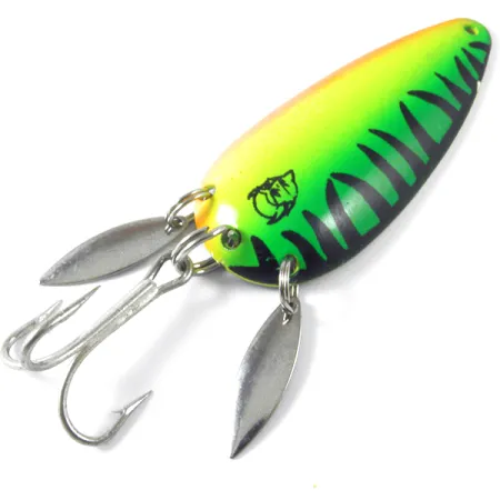 Na złotym spodzie przynęty głęboko wybito wagę 3/4 oz (21 g), co odpowiada słusznemu rozmiarowi Dardevlet. Wahadłówka Eppinger Dardevle Dardevlet Klicker o kodzie produktu 3755 wyróżnia się intensywną kolorystyką Fire Tiger, łączącą neonową żółć i zieleń z wyraźnymi czarnymi, pionowymi pasami. Przy długości 2 3/4 cala (7 cm) błystka została wyposażona w dwie małe, srebrne paletki zamontowane na tylnym kółku łącznikowym, które podczas prowadzenia generują dodatkowe odblaski i efekty dźwiękowe. Na rewersie znajduje się sygnatura producenta z Dearborn MI, będąca znakiem rozpoznawczym marki od czasu przeniesienia produkcji w 1959 roku. Stan tego egzemplarza oceniono na 5/5 – zarówno zbrojenie, jak i powłoka lakiernicza są w nienagannym stanie. Z tyłu zamontowano klasyczną kotwicę, gotową do ciężkiego łowienia w wodach słodkich.