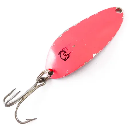 Na polerowanym, niklowanym rewersie wybito kultowy napis „DEVLE-DOG 5300 DETROIT U.S.A.”, co podkreśla przemysłową historię marki Eppinger. Awers pokryto jaskrawą, różową farbą fluorescencyjną reagującą na światło UV, co zapewnia doskonałą widoczność przynęty w różnych warunkach oświetleniowych. Przy wadze 1/3 oz (10 g) i długości 2" (5 cm), ten egzemplarz o kodzie produktu 4845 stanowi przykład klasycznej, średniej wielkości błystki wahadłowej. Stan przynęty oceniono na 4/5; widoczne są lekkie ubytki farby na krawędziach, jednak front pozostaje jasny i czysty, z wyraźnym czarnym logotypem przedstawiającym głowę diabła. Wyposażona w kotwicę w starym stylu oraz solidne kółko łącznikowe, na których powierzchniach metalowych widać jedynie delikatne ślady czasu. Te dociążone wahadłówki zostały zaprojektowane z myślą o rzutach w pobliże podwodnych struktur, gdzie prosty metalowy korpus i jego wklęsły profil pracują w wodzie podczas jednostajnego prowadzenia. Jako produkt legendarnej firmy Eppinger, założonej przez Lou Eppingera w Detroit w 1906 roku, stanowi autentyczny element wędkarskiego dziedzictwa stanu Michigan.