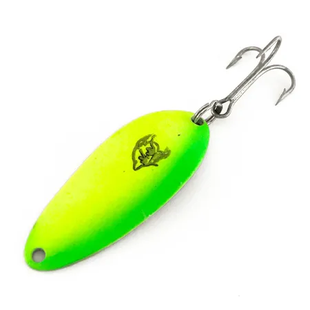 Intensywne, fluorescencyjne żółto-zielone malowanie wyróżnia tę wahadłówkę marki Eppinger, oznaczoną kodem produktu 7636. Ważąca 10 g (1/3 oz) przy długości całkowitej 5 cm (2 cale), Devle Dog 5300 UV stanowi kontynuację tradycji rzemieślniczych zapoczątkowanych przez Lou Eppingera w 1906 roku. Choć w świetle dziennym prezentuje się w jaskrawym odcieniu chartreuse, została zaprojektowana z myślą o widoczności w trudnych warunkach oświetleniowych, emitując głęboką zieloną poświatę pod wpływem promieni UV. Ten konkretny egzemplarz jest nieużywany, posiada gładki tył w kolorze niklu oraz solidną kotwicę osadzoną na mocnym kółku łącznikowym. Kultowe logo z głową diabła umieszczono centralnie na malowanej stronie, tłocząc je przy użyciu precyzyjnych matryc w fabryce w Dearborn w stanie Michigan. Przynęta charakteryzuje się dużą uniwersalnością i nadaje się zarówno do spinningu, jak i trollingu w wodach o różnej przejrzystości, gdzie jaskrawa powłoka fluorescencyjna zapewnia wyraźny profil na tle dna.