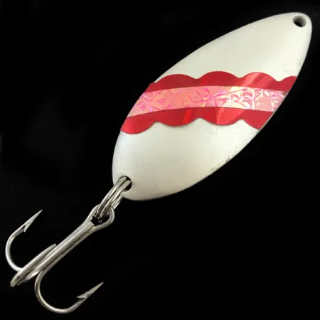 Wyraźne wytłoczenie na rewersie „DEVLE-DOG 5400 DETROIT U.S.A.” sprawia, że ta wahadłówka Eppinger to kawałek klasycznej historii wędkarstwa z Michigan. Awers charakteryzuje się czystą perłową bazą (White Pearl) z ząbkowanymi czerwonymi pasami po bokach i centralną wklejką z różowej taśmy holograficznej, która świetnie odbija światło. Ten egzemplarz, oznaczony kodem produktu 5535, ma długość 2 1/4 cala (5,5 cm) i wagę 2/3 uncji (18 g). Stworzona z myślą o uniwersalności, wahadłówka należy do typu UV Glow i Fluorescent, co dzięki specjalnym powłokom pozwala zachować widoczność w głębokiej lub mętnej wodzie. Uzbrojenie składa się z wysokiej jakości kotwicy zamocowanej na kółku łącznikowym oraz pojedynczego oczka na linkę na węższym końcu. Patrząc na powłokę i uzbrojenie, przynęta jest w stanie nieużywanym. Eppinger od 1906 roku używa autorskich matryc do swoich wahadłówek, a wklęsły kształt serii 5400 zaprojektowano dla uzyskania konkretnej pracy wahadłowej podczas prowadzenia. To solidna, mocna przynęta, która sprawdzi się zarówno w kolekcji, jak i w pudełku wędkarskim.