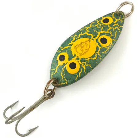Zielono-żółty lakier typu crackle tworzy klasyczny wzór żabki na wierzchniej stronie tej wahadłówki o wadze 14 g (1/2 oz). Na przodzie widoczne są cztery czarne kropki otaczające centralne żółte koło, w którym wyraźnie zaznaczono kultowe logo z profilem psa. Ten egzemplarz o długości 5,5 cm (2 1/4") można zidentyfikować po sygnaturze „DEVLE-DOG 7700 DETROIT U.S.A.” na niklowanym rewersie. Ten konkretny model o kodzie produktu 4478 stanowi element historii marki Eppinger z okresu ich oryginalnej produkcji w Detroit. Kółko łącznikowe trzyma solidną kotwicę, która nie wykazuje żadnych śladów użytkowania ani zużycia. Przy ocenie 5/5, powłoka lakiernicza na całej podłużnej powierzchni pozostaje wyjątkowo wyraźna i zachowana w doskonałym stanie. Zaprojektowana do spinningu lub trollingu, ciężka metalowa konstrukcja zapewnia znaczną masę przy jej kompaktowym rozmiarze.
