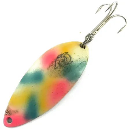 Front tej wahadłówki o długości 2 1/4" (5,5 cm) zdobi efektowne wykończenie Rainbow Pearl, bazujące na perłowym podkładzie. Całość dopełniają nieregularne nakropienia w kolorze żółtym, różowym oraz głębokiej, niebiesko-zielonej barwie. Na korpusie wyraźnie widoczne jest kultowe czarne logo z głową diabła, będące symbolem wieloletniej historii przynęt Eppinger. Przy wadze 1/2 oz (14 g), model ten posiada spód z polerowanego niklu z głębokim tłoczeniem „DEVLE-DOG 7700 DETROIT U.S.A.” i oznaczony jest kodem produktu 5616. Stan tego konkretnego egzemplarza oceniono na 4/5; zachował on lśniącą, odblaskową powierzchnię na spodzie oraz wyraźną kolorystykę na przodzie. Solidna konstrukcja z grubej blachy została wyposażona w mocną kotwicę, co jest cechą charakterystyczną trwałych błystek wahadłowych produkowanych od początków działalności firmy w Michigan. W lakierze widoczne są drobne płatki brokatu, które nadają wykończeniu subtelnego, lśniącego efektu.