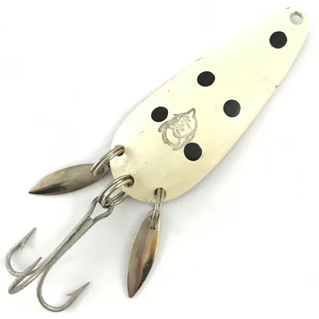 Pięć wyraźnych czarnych kropek odcina się na kremowo-białej emalii tego kolekcjonerskiego egzemplarza. Eppinger Dardevle Imp Klicker o kodzie produktu 4480 posiada charakterystyczny profil w kształcie łezki, spopularyzowany przez Lou Eppingera po założeniu marki w 1906 roku. Wahadłówka ma 5,5 cm (2 1/4") długości i waży 11 g (2/5 oz), a jej stan można określić jako 5/5, co potwierdza czysta powierzchnia i polerowany, niklowany tył. Wersja „Klicker” wyróżnia się dwiema dodatkowymi metalowymi blaszkami akustycznymi zamocowanymi na tylnym kółku łącznikowym, które dodają blasku i generują subtelny metaliczny dźwięk podczas jednostajnego prowadzenia. Na wklęsłym metalowym rewersie wybito wyraźne oznaczenie „DARDEVLE IMP U.S.A.”, a na przedniej stronie widnieje dobrze zachowane logo z głową diabła. Ta konkretna kolorystyka White / Black / Nickel to klasyczny wybór zapewniający dobrą widoczność w wodach o różnej przejrzystości.