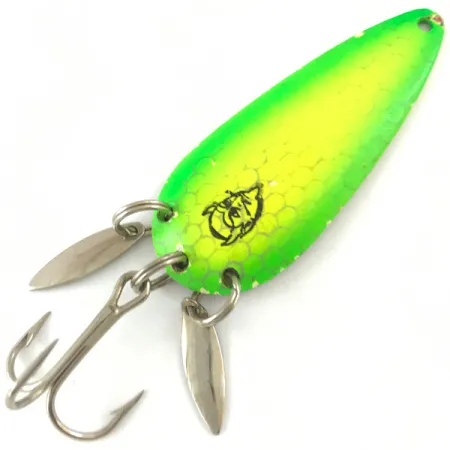 Wybity napis na wypolerowanym spodzie jednoznacznie potwierdza, że jest to oryginalna wahadłówka Dardevle Imp wyprodukowana w USA. Przy wadze 11 g (2/5 oz), model ten posiada kultowe logo z głową diabła naniesione na intensywny wzór plastra miodu w kolorze chartreuse. Ten konkretny model o kodzie produktu 4481 to wersja Klicker, wyposażona w dwie małe metalowe blaszki przy kółku łącznikowym, które generują dźwięk podczas jednostajnego prowadzenia. Błystka ma 5,5 cm (2 1/4") długości i posiada wykończenie Fluorescent Green UV, zaprojektowane tak, by świecić w określonym spektrum światła. Od czasu, gdy Lou Eppinger zaczął ręcznie wytwarzać te przynęty w Detroit ponad sto lat temu, kształt łezki pozostał klasycznym wyborem do spinningu i trollingu. Ta konkretna przynęta jest w stanie nieużywanym, ocenionym na 5/5, z czystym osprzętem i ostrymi grotami kotwicy. Wklęsła konstrukcja korpusu zapewnia charakterystyczną, kolebiącą się pracę, która definiuje tę markę od jej powstania w 1906 roku.