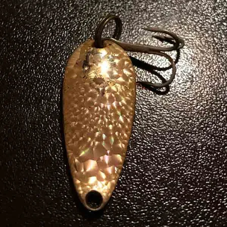 Młotkowane wykończenie typu „Crystal” definiuje wizualny charakter tej błystki Eppinger Dardevle Midget, odbijając światło pod wieloma kątami dzięki swojej teksturowanej powierzchni. Ważąca 3/16 oz (6 g) i mierząca 1 1/2" (3,5 cm) długości wahadłówka to klasyczny wybór na pstrągi lub okonie przy użyciu lżejszego zestawu. Na rewersie błystki wyraźnie widoczne jest wybite oznaczenie „DARDEVLE MIDGET”, będące znakiem rozpoznawczym marki Eppinger, która działa w Michigan od momentu założenia firmy przez Lou Eppingera w 1906 roku. Ta konkretna przynęta, oznaczona kodem produktu 11800, prezentuje stan zachowania 4/5. Metalowy korpus w odcieniu mosiądzu posiada charakterystyczny wklęsły profil, który zapewnia jej specyficzną pracę w toni wodnej. Pojedyncza kotwiczka jest zamocowana za pomocą solidnego kółka łącznikowego. Chociaż Eppinger przeniósł produkcję z Detroit do Dearborn w 1959 roku, proces produkcyjny nadal wykorzystuje autorskie matryce, aby zachować unikalną geometrię tych wytwarzanych w USA wahadłówek. Wzór „Crystal” na wypukłej stronie ma na celu rozproszenie refleksów, oferując inny profil błysku w porównaniu do standardowych, gładkich wariantów Dardevle spotykanych w wielu pudełkach z klasycznym sprzętem.