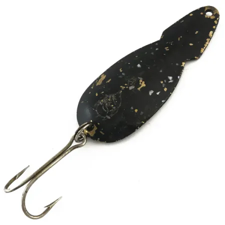 Błystka wahadłowa Eppinger, pokryta srebrnymi i złotymi metalicznymi drobinkami na czarnym, matowym tle, to klasyczna propozycja na warunki o słabej widoczności. Model Mousie-Imp o długości 5,5 cm (2 1/4") i wadze 11 g (2/5 oz), skatalogowany pod numerem 4418, posiada charakterystyczny profil w kształcie łzy, nierozerwalnie kojarzony z tą wywodzącą się z Detroit marką. Powłoka lakiernicza tego egzemplarza nosi autentyczne ślady użytkowania (ocena 4/5) – widoczne są punktowe odpryski i przetarcia na rantach, odsłaniające metal pod czarną farbą. Na wklęsłym rewersie wybita fabryczna sygnatura potwierdza pochodzenie z serii 'DARDEVLE MOUSIE-IMP', co świadczy o zastosowaniu oryginalnych matryc używanych przez firmę Eppinger od połowy XX wieku. Uzbrojenie stanowi solidna kotwica zamocowana na kółku łącznikowym w tylnej części przynęty, natomiast oczko do wiązania linki na przedzie jest czyste i w pełni gotowe do montażu.