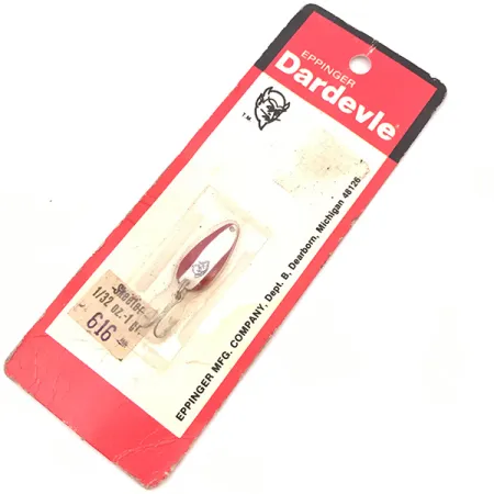 Filigranowa waga 1/32 oz (1 g) definiuje tę ultralekką wahadłówkę Skeeter, która stanowi podstawę oferty Eppinger od czasu przeniesienia firmy do Dearborn w stanie Michigan. Metalowy, tłoczony korpus o długości dokładnie 1 cala (2,3 cm) wykończono kultową emalią w czerwono-białe pasy i opatrzono zastrzeżonym logo z głową diabła. Ten egzemplarz, oznaczony kodem produktu 3912, jest nieużywany i pozostaje fabrycznie zamocowany do oryginalnego, czerwono-białego kartonika. Opakowanie zawiera archiwalne oznaczenia Eppinger Manufacturing Company z adresem przy Schaefer Highway, co jest znakiem rozpoznawczym produkcji z połowy i końca XX wieku. Wyposażona w małą, fabryczną kotwiczkę, cienkościenna konstrukcja modelu Skeeter została zaprojektowana do ultralekkich technik spinningowych z myślą o pstrągach i mniejszych rybach. Na kartoniku zachowała się nawet dawna pieczątka sprzedawcy z numerem 616, dająca wgląd w sposób kategoryzacji przynęt na półkach sklepów wędkarskich przed laty.