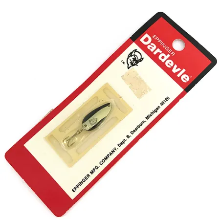 Klasyczny wariant kolorystyczny 602H wyróżnia się wykończeniem w polerowanym złocie z wyraźnym czarnym pasem. Eppinger Dardevle Skeeter o kodzie produktu 7580 bazuje na sprawdzonej, wklęsłej konstrukcji błystki wahadłowej, w której produkcji ten producent z Michigan specjalizuje się od ponad wieku. Przy długości 2,5 cm (1") i wadze zaledwie 2 g (2/32 oz), przynęta ta jest idealna do obławiania mniejszych strumieni i stawów. Egzemplarz znajduje się w oryginalnym blistrze, jest nieużywany, a jego stan oceniono na 6. Na tekturce widnieje charakterystyczne logo Eppinger z głową diabła oraz adres Dearborn, Michigan 48126, co wskazuje na produkcję po przeprowadzce firmy w 1959 roku. Ostra kotwiczka zamocowana na solidnym kółku łącznikowym dopełnia tę ultralekką przynętę.