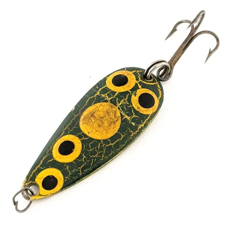 Charakterystyczne zielone wykończenie typu „crackle” zdobi lico tej 4,5-centymetrowej (1 3/4") wahadłówki, prezentując ceniony przez wędkarzy wzór Frog. Kunszt wykonania marki Eppinger jest w pełni widoczny w modelu Dardevle Spinnie o kodzie produktu 12270. Model ten wyróżnia się wyraźnie wklęsłym profilem, co stanowi cechę charakterystyczną marki od czasu, gdy Lou Eppinger zaczął ręcznie wytwarzać przynęty w Detroit. Efekt wizualny tworzą duże żółte koła z czarnym środkiem, osadzone na tle siatki żółtych linii na ciemnozielonej bazie. Po odwróceniu przynęty ukazuje się czysty, srebrzysty rewers z wybitym napisem „DARDEVLE SPINNE U.S.A.”, co potwierdza jej pochodzenie z Dearborn w stanie Michigan. Przy wadze 1/3 oz (9 g) oferuje ona znaczną masę jak na przynętę o tych wymiarach. Uzbrojenie obejmuje kotwiczkę oraz kółko łącznikowe, które wykazują minimalne ślady zużycia. Ten egzemplarz jest doskonale zachowany, co uzasadnia ocenę stanu na 5/5. Wyrazistość liter na rewersie stanowi bezpośredni dowód na użycie oryginalnych matryc produkcyjnych z zakładu Eppingera.