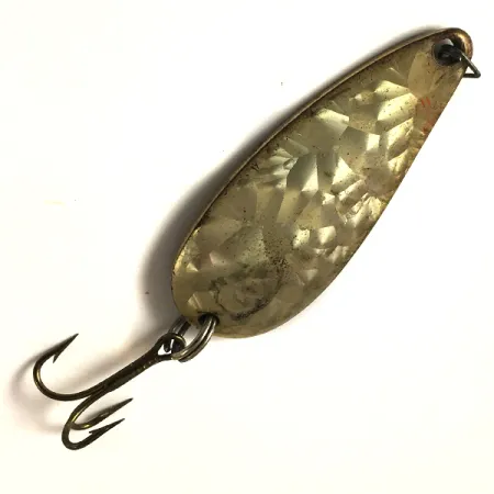 Młotkowana struktura powierzchni w kształcie łusek świetnie odbija refleksy świetlne na mosiężnym korpusie tej klasycznej wahadłówki Eppinger. Ważąca 1/3 uncji (9 g) i mierząca 1 3/4 cala (4,5 cm) wahadłówka Dardevle Spinnie o kodzie produktu 3707 to jeden z mniejszych modeli w legendarnej ofercie marki Eppinger. Na wklęsłej stronie wyraźnie wybito nazwę „DARDEVLE SPIN-NIE”, co jest znakiem rozpoznawczym firmy założonej przez Lou Eppingera w Detroit w 1906 roku. Ten egzemplarz wykończony jest wzorem „Crystal scale”, zaprojektowanym tak, aby generować wyraźne błyski podczas jednostajnego prowadzenia w różnych warunkach wodnych. Uzbrojenie obejmuje oryginalną kotwicę zamocowaną na kółku łącznikowym, co potwierdza solidną konstrukcję – te same przynęty wchodziły niegdyś w skład lotniczych zestawów survivalowych. Stan przynęty oceniono na 5/5; metal zachowuje jasny, czysty wygląd bez wyraźnych śladów zużycia. Mimo że firma przeniosła się do Dearborn w stanie Michigan w 1959 roku, ten klasyczny projekt pozostaje ceniony przez wędkarzy za swoją łowność i stabilność podczas rzutów. Masa jest idealnie rozłożona jak na ten rozmiar, co pozwala na precyzyjne posłanie przynęty podczas polowania na pstrągi lub inne drapieżniki w mniejszych zbiornikach.