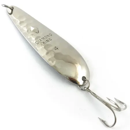 Srebrne, młotkowane wykończenie, takie jak w modelu Luhr Jensen Diamond King 4, zapewnia klasyczne refleksy, na których od dziesięcioleci polegają pasjonaci trollingu. Przy wadze 1/2 oz (14 g) i długości 3 3/4" (9,5 cm), ten egzemplarz o kodzie produktu 4657 prezentuje wysoką jakość wykonania charakterystyczną dla produktów z USA. Na wklęsłej stronie wyraźnie wybito nazwę „DIAMOND KING” oraz cyfrę „4”, które otacza charakterystyczna, młotkowana faktura. Na stronie wypukłej większość powierzchni pokrywa precyzyjny wzór plastra miodu, przerwany jedynie przez wyraźny, wypukły detal w kształcie rombu w górnej części. Ta konkretna przynęta zachowana jest w stanie 5/5 i prezentuje się wyjątkowo dobrze dzięki lśniącym, metalicznym powierzchniom i ostrej kotwicy. Osprzęt składa się z wytrzymałych kółek łącznikowych przy oczku do mocowania linki oraz przy kotwicy, zaprojektowanych pod kątem wymagań trollingu. Właściwości odblaskowe dwóch tekstur — młotkowanej wewnątrz i heksagonalnej na zewnątrz — maksymalizują rozpraszanie światła na różnych głębokościach.