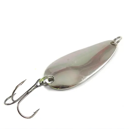 Ważąca 3/4 oz (21 g) metalowa wahadłówka to dowód jakości osprzętu Glen Evans produkowanego w USA. Korpus w kształcie łezki pokryto polerowaną powłoką niklową, co zapewnia wyraźny odblask przy różnych technikach spinningowania. Przynęta o długości 2 1/2 cala (6,5 cm) charakteryzuje się prostym, ale skutecznym profilem, typowym dla klasycznego amerykańskiego sprzętu z połowy ubiegłego wieku. Solidna kotwica jest zamocowana za pomocą wytrzymałego kółka łącznikowego w tylnej części, natomiast przednie oczko pozostaje gotowe do wpięcia agrafki lub krętlika. Stan oceniamy na mocne 5/5 – lustrzana powierzchnia jest wyjątkowo czysta i wolna od widocznych śladów przechowywania. Kolekcjonerzy z łatwością rozpoznają nazwę Evans wytłoczoną na wewnętrznym łuku metalu, co jest znakiem rozpoznawczym serii produkcyjnej 2906. Ze względu na swoją masę i aerodynamiczny kształt, model ten doskonale nadaje się do osiągania dużych dystansów i znacznych głębokości podczas rzutów.