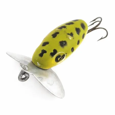 Kultowy metalowy ster z wyraźnym tłoczeniem „Jitterbug” i „Fred Arbogast, Akron, Ohio” definiuje klasyczną sylwetkę tego 1 1/2" (4 cm) powierzchniowego crawlera. W malowaniu Green Frog korpus posiada żywą żółto-zieloną bazę, akcentowaną wyraźnymi czarnymi kropkami i czystym kremowym spodem. Przy wadze 1/8 oz (4 g) ten kompaktowy rozmiar został zaprojektowany specjalnie do lekkich zestawów i finezyjnego łowienia powierzchniowego. Dwie śruby pewnie mocują szeroki, aluminiowy ster w kształcie serca do nosa przynęty, co generuje rytmiczne pluskanie podczas prowadzenia. Uzbrojenie stanowi pojedyncza kotwica z tyłu, zgodnie z oryginalną konfiguracją dla tego mniejszego modelu. Stan oceniany na 4/5, powłoka lakiernicza jest w dużej mierze nienaruszona, z niewielkimi śladami czasu typowymi dla przynęt vintage. Numer referencyjny przedmiotu #24568 dla wariantu Green Frog.