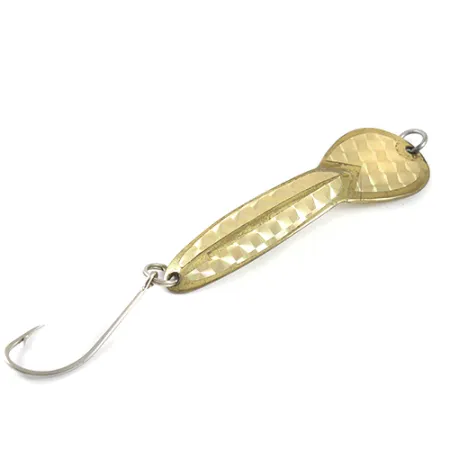 Złocone tłoczenia w kształcie łusek na wypukłej stronie tej wahadłówki o wadze 23 g (3/4 oz) efektownie odbijają światło, co pozwala natychmiast rozpoznać klasyczny model Glen Evans Loco 4. Czytelna sygnatura „LOCO 4” wybita na spodzie potwierdza, że jest to egzemplarz z wczesnego okresu produkcji w USA, zanim wzór ten został przejęty przez firmę Luhr Jensen. Stan zachowania oceniony na 4/5 objawia się delikatnymi, naturalnymi śladami na powłoce, które nie naruszają oryginalnej faktury przynęty. Błystka o długości 9 cm (3 1/2") uzbrojona jest w pojedynczy hak i mocne kółko łącznikowe, co czyni ją świetnym wyborem na szczupaki żerujące na blatach lub w miejscach o słabym uciągu, do głębokości około 1 m. Doświadczeni wędkarze cenią ten model (kod produktu 1775) za specyficzną geometrię w kształcie łezki, wyważoną idealnie do spinningowania i trollingu w wodach stojących. Wyraźnie rozszerzający się ogon oraz wąskie przewężenie to cechy charakterystyczne dla oryginalnych serii produkcyjnych Evansa.