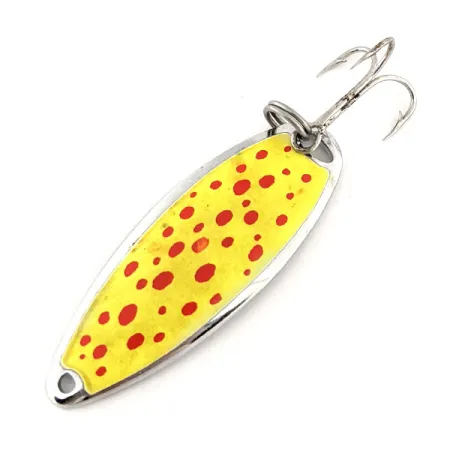 Przednią część tej wahadłówki o wadze 1/3 oz (10 g) pokrywa jaskrawożółta emalia z wyraźnym czerwonym nakropieniem. Tył został wykończony polerowanym niklem, na którym wyraźnie wytłoczono nazwę „JOHNSON'S SPRITE”. Przynęta o długości 2 1/4 cala (5,5 cm) i kodzie produktu 11763 to świetnie zachowany przykład amerykańskiego sprzętu wędkarskiego z połowy XX wieku. Ocena stanu 5/5 podkreśla doskonały stan lakieru oraz wysoki połysk niklowanej powłoki. Na uzbrojenie składa się solidne kółko łącznikowe oraz ostra kotwica, co potwierdza bardzo dobry stan techniczny przynęty. Firma Johnson produkowała te błystki w USA z grubej blachy, co ułatwia dalekie rzuty podczas połowu gatunków słodkowodnych. Wybity otwór w węższej części pozwala na łatwy montaż przy użyciu różnych agrafek lub bezpośrednie wiązanie węzłów.