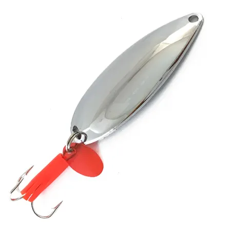 Wyraźne oznaczenie "JOHNSON'S SPRITE" wybite na polerowanej, niklowanej powłoce potwierdza, że ta wahadłówka to autentyczny fragment historii amerykańskiego sprzętu wędkarskiego. Przy długości 7 cm (2 3/4") i wadze 14 g (1/2 oz), model ten pochodzi z czasów, gdy produkcja marki Johnson odbywała się jeszcze w USA. Lustrzane, niklowane wykończenie zestawiono z charakterystycznym czerwonym plastikowym skrzydełkiem przy ogonie, które ma zapewniać kontrast wizualny dla błysków metalowego korpusu. Uzbrojenie obejmuje solidną kotwicę z jaskrawopomarańczową koszulką, zachowaną w doskonałym stanie. Przynęta oznaczona kodem produktu 4648 utrzymuje stan 5/5, prezentując wyjątkowo czystą i lśniącą powierzchnię. Budowa tego egzemplarza jest dowodem na trwałość technologii galwanicznych stosowanych przez producenta przed przeniesieniem produkcji za granicę.