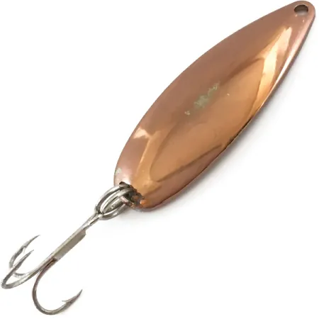 Miedziane wykończenie powierzchni tej klasycznej wahadłówki zapewnia charakterystyczne, ciepłe refleksy. Przy długości 7 cm i wadze 17 g, przynęta ta jest wyraźnie wyczuwalna wędziszczem i doskonale nadaje się do siłowych rzutów. Na wklęsłej stronie widnieje wyraźne tłoczenie z nazwą modelu, co jest znakiem rozpoznawczym egzemplarzy wyprodukowanych pierwotnie w USA, zanim produkcję przeniesiono do Chin. Wahadłówka o kodzie produktu 5080 uzbrojona jest w solidną kotwicę oraz niezawodne kółko łącznikowe, gwarantujące pewny hol. Współcześni kolekcjonerzy często poszukują właśnie tych amerykańskich oznaczeń ze względu na wysoką jakość obróbki metalu, z której słynęły wczesne partie produkcyjne. Egzemplarz zachowany w stanie 4/5 posiada zadbaną powierzchnię i równe krawędzie, które podkreślają jakość oryginalnej powłoki.