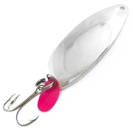 Głęboko wybite na rewersie klasyczne oznaczenia marki oraz niklowane wykończenie na wysoki połysk podkreślają amerykańskie pochodzenie tego egzemplarza. Przy długości 4,5 cm (1 3/4") i wadze 5 g (3/16 oz), model o kodzie 5311 to kolekcjonerski egzemplarz błystki Johnson Sprite, wyprodukowany w USA jeszcze przed przeniesieniem produkcji za granicę. Wahadłówka jest wyposażona w półprzezroczysty, czerwony wabik z tworzywa przy ogonie, który zapewnia wyraźny kontrast kolorystyczny z metalicznym korpusem. Ta nieużywana przynęta zachowała stan 5/5, z idealnie czystą powierzchnią i ostrą kotwiczką. Osprzęt pozostał oryginalny, z solidnym kółkiem łącznikowym charakterystycznym dla dawnych standardów produkcji firmy Johnson. Każdy szczegół, od tłoczonych napisów po nienaruszoną powłokę, sugeruje, że przedmiot ten był przechowywany w bezpiecznych warunkach, a nie w pudełku wędkarskim.