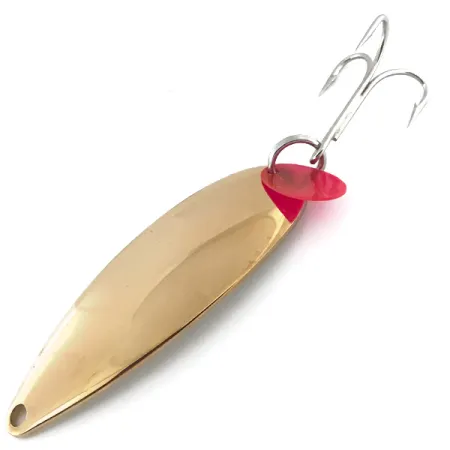 Na polerowanym, pozłacanym korpusie widnieje wyraźnie wybita nazwa „Johnson Sprite”, która definiuje ten klasyczny element historii amerykańskiego sprzętu wędkarskiego. Wahadłówka o wadze 17 g (3/5 oz) i długości 10 cm (4") reprezentuje oryginalną jakość marki z czasów, gdy produkcja odbywała się jeszcze w USA, a nie w Chinach. Lustrzane, złote wykończenie uzupełnia charakterystyczny czerwony wabik przy kółku łącznikowym, który służy jako celownik w pobliżu ostrej kotwicy. Egzemplarz skatalogowany pod numerem 8851 zachował się w doskonałym stanie – czysta powierzchnia i nienaruszone uzbrojenie pozwalają ocenić go na 5/5. Zarówno dla wędkarzy, jak i kolekcjonerów, solidna konstrukcja z grubej blachy oraz niezawodne kółka łącznikowe wyróżniają te modele vintage na tle współczesnych odpowiedników. Profil w kształcie łzy doskonale sprawdza się w różnych technikach spinningowych i trollingowych.