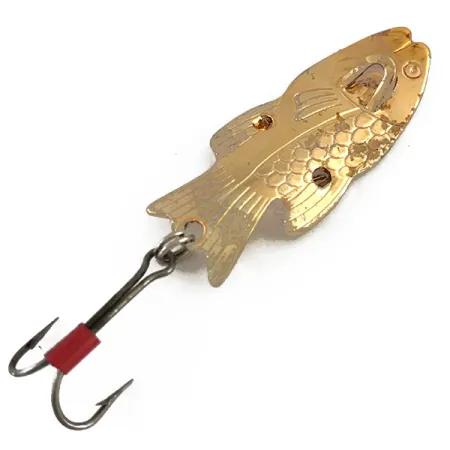 Ta metalowa wahadłówka o wadze 7 g (1/4 oz) z wybitą sygnaturą „KATCH KING PAT. P.” wyróżnia się wyraźną sylwetką ryby w jasnym, złotym wykończeniu. Ten wyprodukowany w USA w 1958 roku egzemplarz posiada przemyślaną konstrukcję mechaniczną, w której korpus o długości 5 cm (2") został ozdobiony tłoczoną łuską i wytłoczonymi pokrywami skrzelowymi. Skatalogowana pod kodem produktu 4805, konstrukcja posiada dwa widoczne nity oraz wycięcie w kształcie litery „U” w pobliżu główki, co pozwala na różne sposoby zbrojenia. Przynęta uzbrojona jest w hak dwuramienny mocowany za pomocą drutu, z charakterystyczną czerwoną koszulką na trzonku; całość zaprojektowano jako przynętę antyzaczepową do łowienia w gęstej roślinności. Pozłacana powierzchnia wykazuje lekkie, naturalne ślady użytkowania, co jest zgodne z oceną stanu zachowania 4/5.