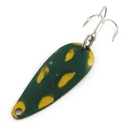 Zielono-żółte malowanie w deseń żabki podkreśla profil tej wahadłówki Keystone o wadze 5 g (3/16 oz). Ta pochodząca z USA przynęta mierzy 4,5 cm (1 3/4") i jest skatalogowana pod numerem produktu 23494. Powłoka lakiernicza nosi naturalne ślady czasu, co pozwala ocenić stan tego zadbanego egzemplarza na 4/5. Przynęta wyposażona jest w solidne kółeczko łącznikowe i jasną kotwiczkę w tylnej części, natomiast przód wieńczy proste, okrągłe oczko do mocowania linki.