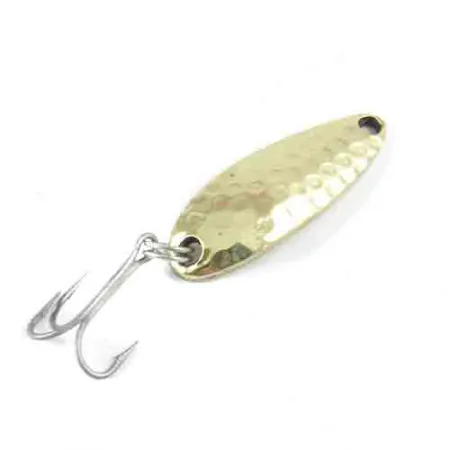 Powierzchnia z młotkowanego mosiądzu wspaniale odbija światło w tym klasycznym modelu Luhr Jensen o wadze 1/3 oz (9 g), a samo wykończenie od dziesięcioleci dowodzi swej skuteczności zarówno w wodach słodkich, jak i słonych. Mierzący dokładnie 1 1/2 cala (4 cm) egzemplarz to niezwykle wszechstronny model 2964 o kultowym, wąskim i wydłużonym kształcie wahadłówki, która idealnie pasuje do każdego lekkiego zestawu. Stan zachowania jest idealny (5/5) – mosiądz zachował głęboki, czysty blask oraz oryginalny, fabryczny połysk. Na rewersie nazwa Luhr Jensen oraz napis „KROCODILE” są głęboko i wyraźnie wybite w metalu. Pojedyncze kółko łącznikowe mocuje przy ogonie ostrą kotwicę, co sprawia, że uzbrojenie jest tak samo niezawodne, jak sam solidny korpus. Młotkowana struktura na wypukłej stronie generuje wielokierunkowe odblaski podczas prowadzenia, co świetnie imituje łuski drobnicy.