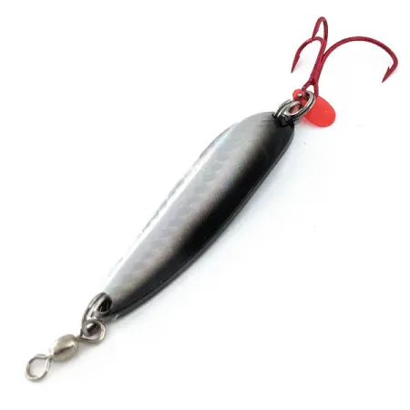 Niklowana powłoka na korpusie o długości 6,5 cm zapewnia intensywne odblaski tej ciężkiej wahadłówce. Przy wadze 21 g, Luhr Jensen Krocodile #4 posiada wąski korpus z grubej blachy, zaprojektowany z myślą o schodzeniu na znaczne głębokości, w których trzymają się drapieżniki. Ten egzemplarz, o kodzie produktu 14909, charakteryzuje się wyraźnym czarnym gradientem na grzbiecie oraz holograficzną wklejką z wzorem łuski wzdłuż środka. Uzbrojenie obejmuje jaskrawoczerwoną kotwicę oraz mały, czerwony element wabiący z tworzywa, zamontowane na wytrzymałym kółku łącznikowym. Przednia część wyposażona jest w krętlik baryłkowy, który zapobiega skręcaniu linki podczas prowadzenia przynęty na dużym dystansie. W obecnym stanie 5/5 metal zachowuje pełny blask, a wzór łuski nie wykazuje śladów odchodzenia czy blaknięcia. Tylne kółko łącznikowe jest powiększone, co zapewnia kotwicy maksymalną swobodę ruchu.